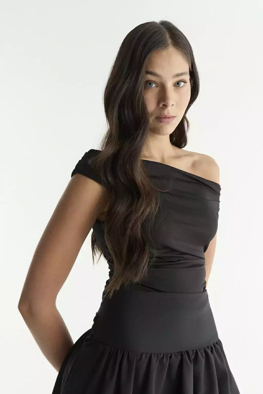 Descripción: top de lycra elastizada con frunce en laterales para crear un efecto ajustado tipo cinturilla, los hombros los podes adaptar con prefieras (efecto buche, hombros al aire o musculosa)